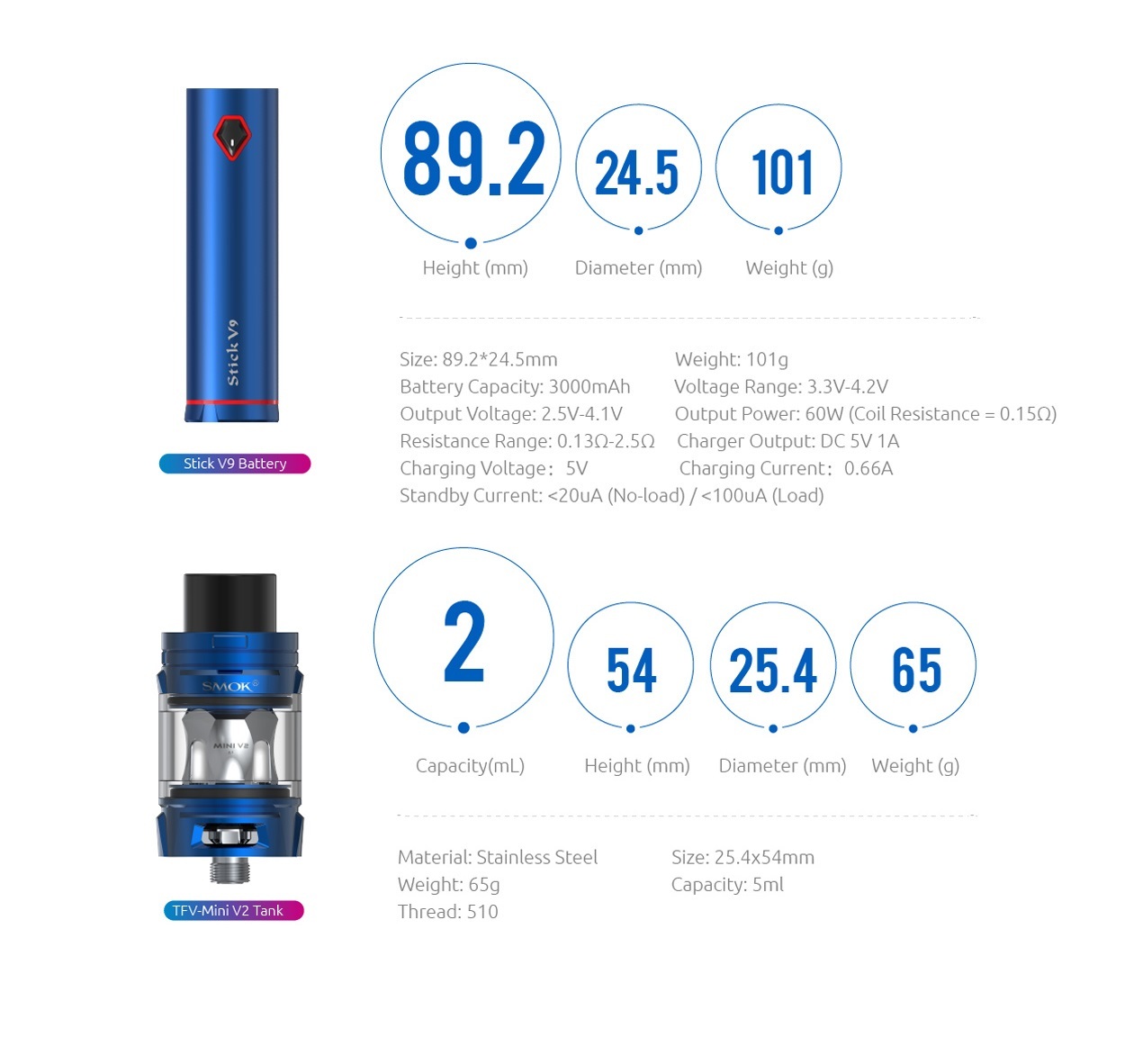 Stick V9 comes with a built-in 3000mAh battery and TFV8 Baby V2 tank,